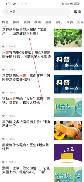 2、登錄后進入首頁瀏覽推薦的資訊內容,找到秋冬適合泡水的寶藏果相關條目,點擊進入該資訊的詳情頁面。