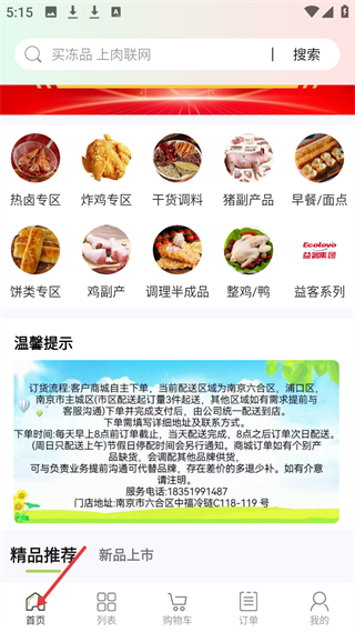 1、首頁有熱鹵專區等眾多凍品分類,還有溫馨提示板塊說明訂貨流程等信息,方便用戶了解規則并選購商品。