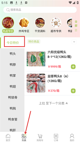 2、列表頁有熱鹵專區等分類入口,展示今日特價的鴨頭類商品,如六和優級鴨頭、益客鴨頭等,便于用戶查看特價凍品。