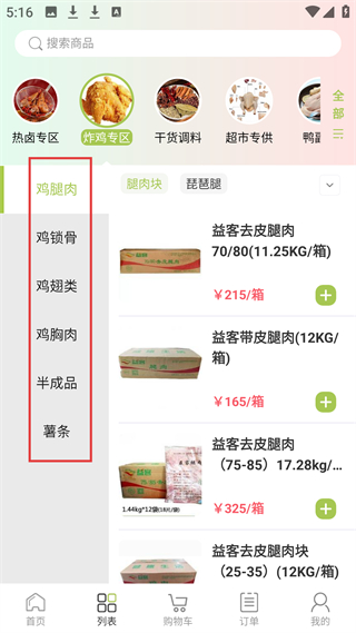 3、炸雞專區,有雞腿肉、雞鎖骨等細分分類,展示益客去皮腿肉等多款商品,方便用戶選購炸雞相關凍品。