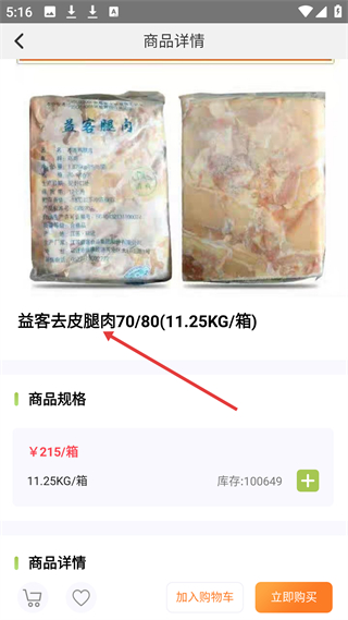 4、益客去皮腿肉詳情頁,展示商品包裝,標注價格等信息,提供加入購物車和立即購買功能,方便用戶了解商品并下單。