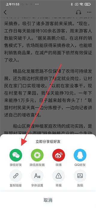 4、點擊分享按鈕,彈出分享選項,可選擇微信好友等渠道,將文章分享給他人,傳遞相關資訊內容。