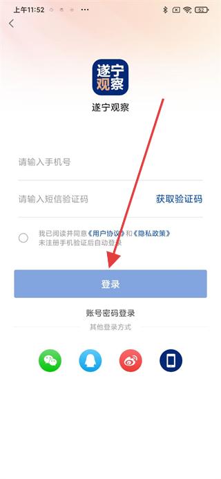 1、打開遂寧觀察,進入登錄頁面,輸入手機號并獲取驗證碼,填寫驗證碼后勾選用戶協議和隱私政策,點擊登錄按鈕完成賬號登錄。