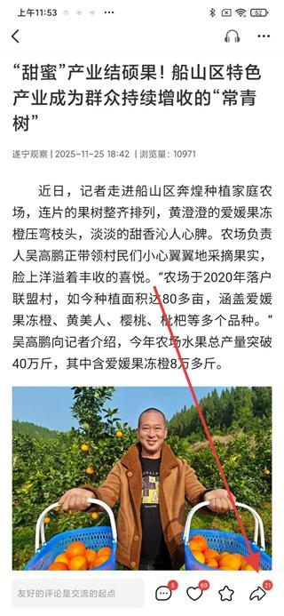3、在文章詳情頁閱讀完整內容后,如果覺得新聞內容不錯,可以點擊下方的分享按鈕。