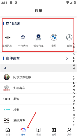 2、選車頁,含熱門品牌等板塊,覆蓋江淮大眾等品牌,支持條件篩選,助力用戶定位目標車型,簡化購車選車流程。