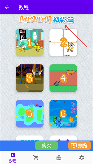 2、初級篇課程頁,展示課程分章節內容,支持購買或預覽,幫助用戶系統學習Scratch入門知識。