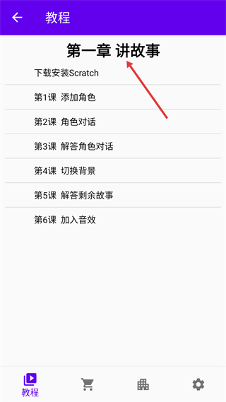 3、課程章節列表頁,以講故事為主題劃分課程內容,明確每課學習目標,助力用戶按步驟掌握Scratch操作。