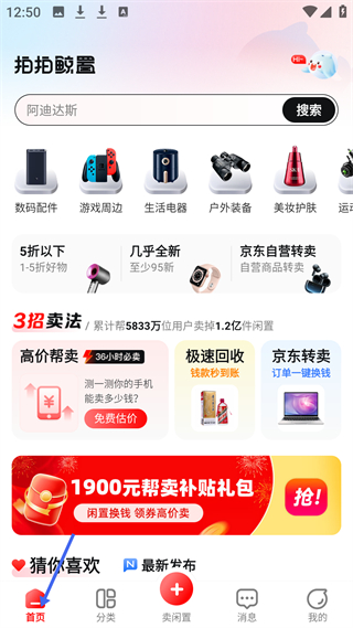 1、首頁,有搜索欄,展示數碼配件等分類,還有5折以下等商品標簽及高價幫賣等功能入口,助力閑置物品交易。