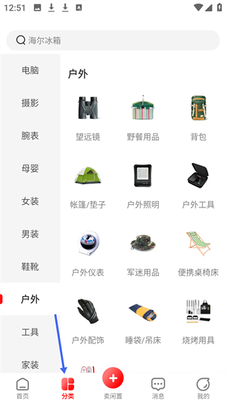 2、分類戶外板塊,細分望遠鏡、野餐用品等品類,每個品類下有具體商品分類,方便查找戶外類閑置物品。