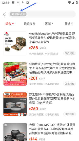 3、野餐用品商品列表頁,展示戶外野餐包、燒烤爐等商品,標注價格、優惠及所在地信息,助力選購野餐類閑置物品。