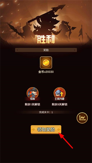 4、關卡勝利后領取金幣等獎勵,還可解鎖弓兵、士兵升級等新內容,積累資源,提升部隊實力。