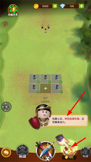 1、花費金幣招募士兵,將陣型填充滿,提升戰力,為關卡對決做好準備,開啟策略對戰之旅。