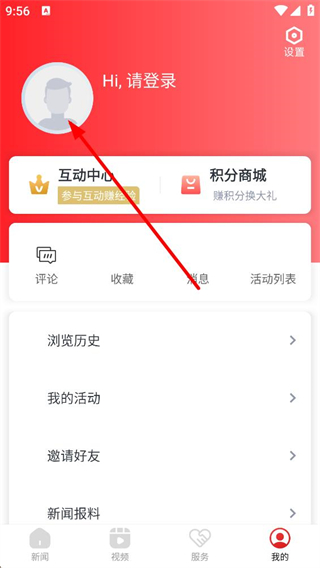 2、我的頁面中,可查看互動中心、積分商城等功能入口,也能使用評論、收藏等互動操作,管理瀏覽歷史等內容。