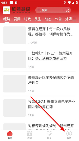 1、進入歐潭融媒主界面,可通過經濟、要聞等頻道瀏覽各類資訊,點擊底部我的選項,即可進入個人相關功能頁面。
