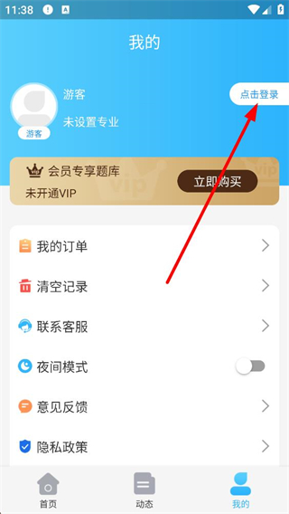 2、點擊我的進入個人界面,當前為游客身份,可點擊登錄,還能開通會員專享題庫,同時支持管理訂單清空記錄聯系客服等操作。