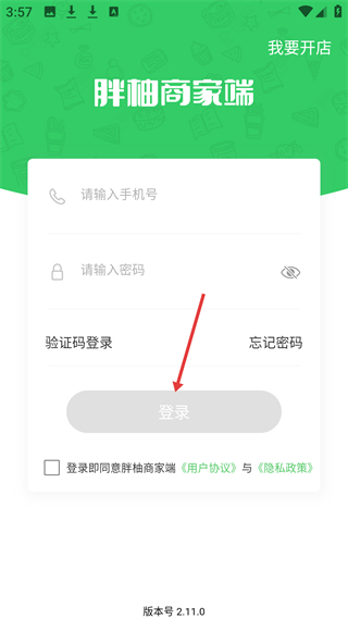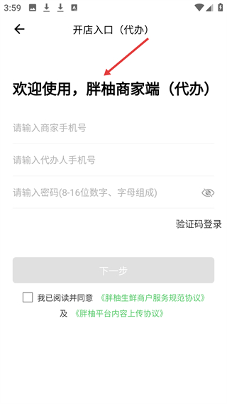4、開店入口代辦頁,需輸商家手機號、代辦人手機號和密碼,同意協議后可進入下一步。