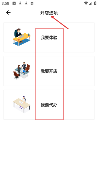3、開店選項頁,有我要體驗、我要開店、我要代辦三種開店模式供商家選擇。