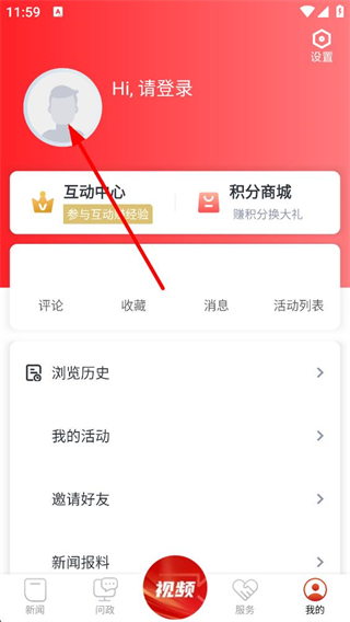 2、我的頁面可進行登錄操作,頁面包含互動中心積分商城等功能,還能查看瀏覽歷史管理收藏消息,參與平臺相關活動。