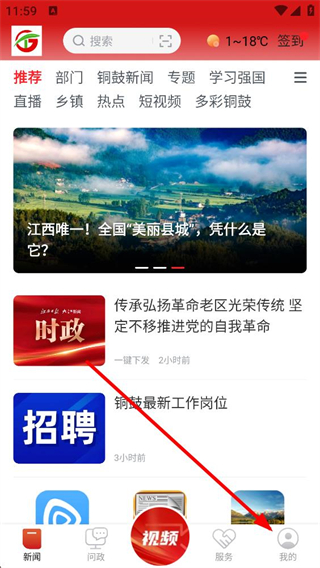 1、進入應用首頁可瀏覽推薦內容,本地新聞招聘等信息,點擊底部我的進入個人相關頁面,還能通過頂部搜索欄查找所需內容。