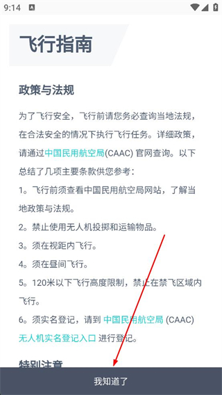 3、登錄后進入飛行指南頁面閱讀政策與法規,了解飛行前需查詢當地法規、禁飛區域等條款,點擊我知道了。