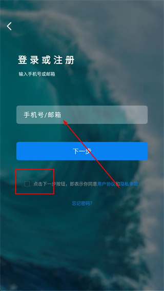 2、輸入手機號或郵箱,勾選同意用戶協議和隱私條款,點擊下一步,進行賬號登錄或注冊。