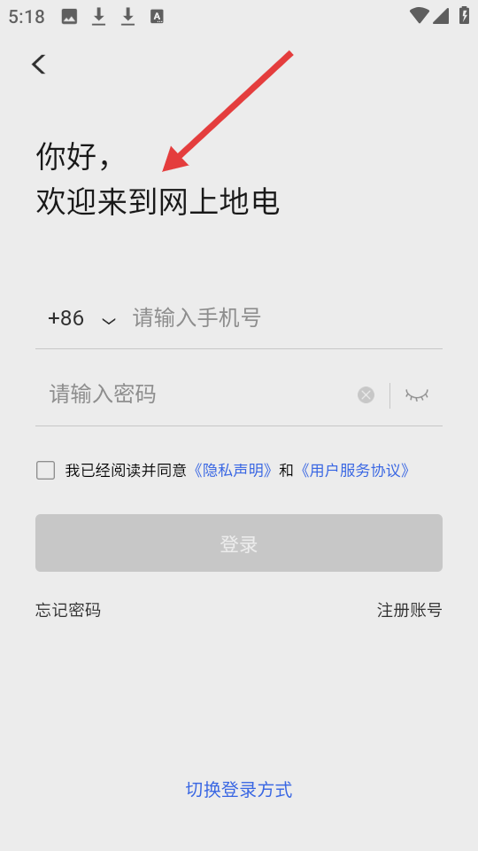 1、網上地電APP登錄頁有歡迎語,需輸手機號、密碼并勾選協議登錄,也能切換方式或注冊操作便捷。