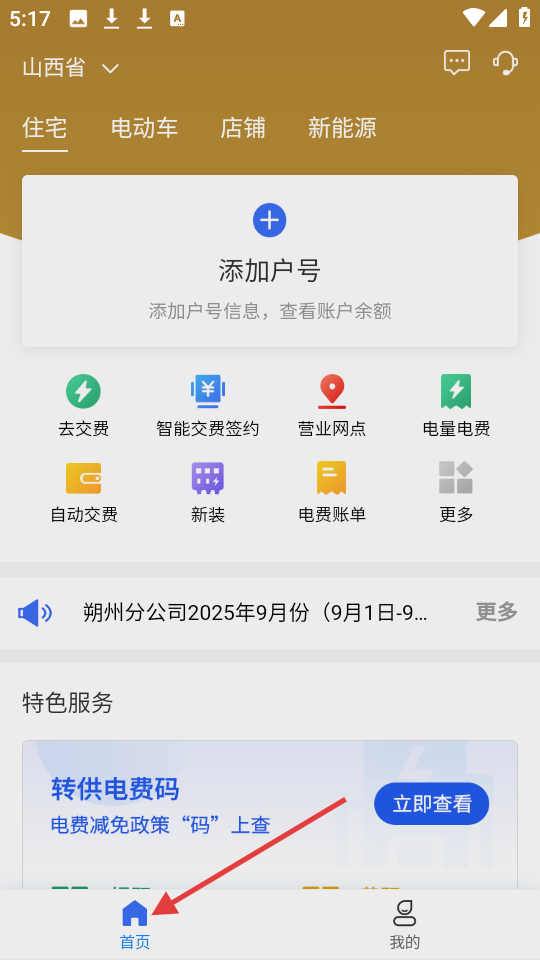 2、首頁定位山西,分住宅、電動車等板塊,涵蓋去交費、營業網點等功能,展示特色服務與檢修計劃。