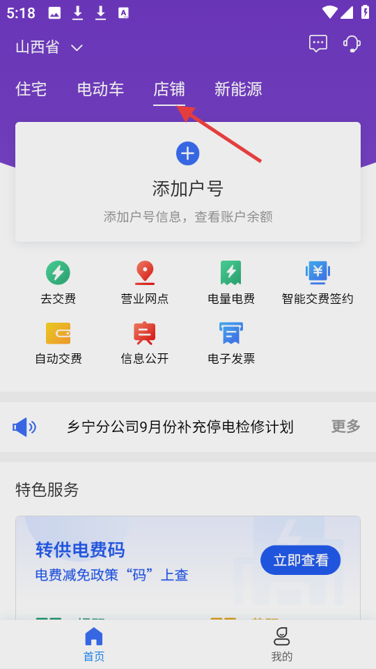 3、店鋪分類頁面功能布局與首頁相似,可添加戶號、自動交費等,同樣有檢修計劃和特色服務展示。