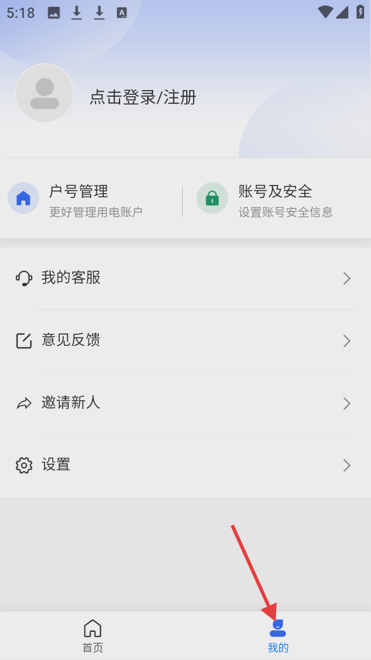 4、我的頁面提示登錄注冊,含戶號管理、賬號安全等選項,以及客服、反饋等服務方便用戶管理賬號。