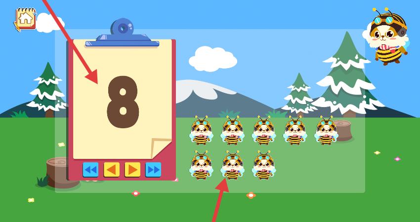 2、數字練習界面卡片展示數字8,旁側蜜蜂角色排列,箭頭引導計數互動,通過可愛角色與數字結合,幫助孩子練習數感。