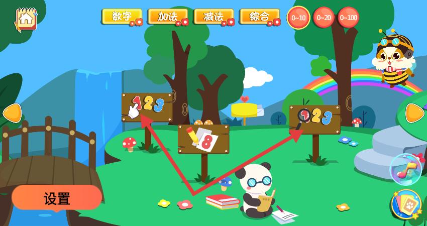 1、主界面是卡通森林場景熊貓角色伏案學習,上方分數字、加減等模塊,標牌引導學習,蜜蜂角色飛舞,營造趣味數學學習氛圍。