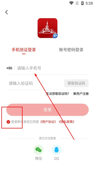 1、進入廣漢融媒app手機驗證登錄頁面,勾選登錄即同意相關協議,輸入手機號后點擊獲取驗證碼,填寫收到的驗證碼,最后點擊登錄按鈕完成賬號登錄。