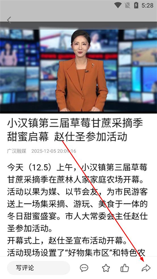 3、在資訊詳情頁閱讀小漢鎮采摘季活動的內容,了解活動開幕時間參與人員及活動形式等信息,點擊下方的分享按鈕。