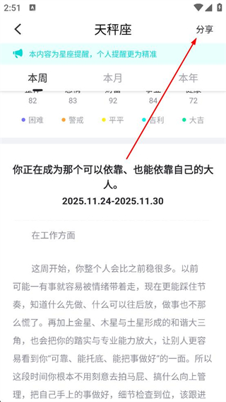 3、點擊本周提醒區域進入詳情頁,查看天秤座本周的運勢評分及具體內容,了解工作等方面的分析建議,點擊分享按鈕分享給好友。