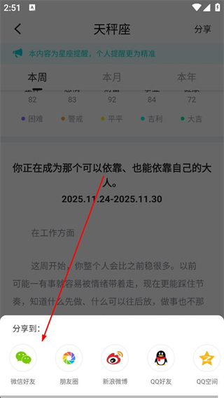 4、在詳情頁點擊分享按鈕選擇微信好友朋友圈等渠道,將天秤座的本周運勢內容分享給他人。