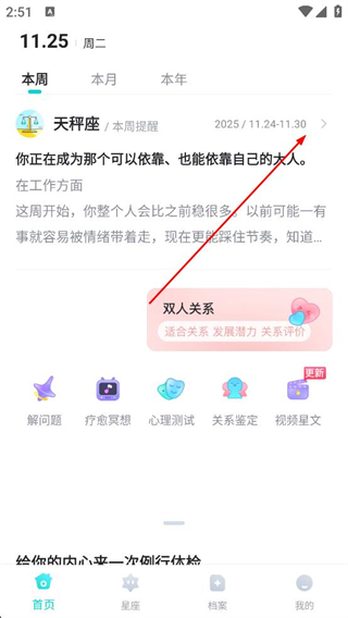 2、進入星座頁面查看本周提醒,了解2025年11月24到11月30期間的工作等方面提示,瀏覽雙人關系等功能板塊。