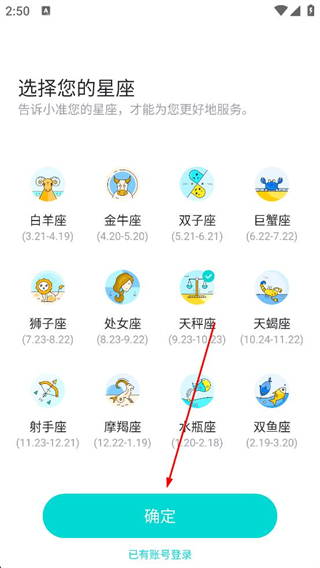 1、進入軟件進入選擇星座頁面,瀏覽白羊座金牛座等星座選項,選擇天秤座,點擊確定按鈕完成星座選擇。