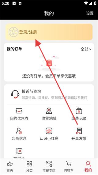 2、進入我的頁面,再次點擊登錄注冊,進入登錄界面,準備完成賬號的登錄操作,開啟購物體驗。