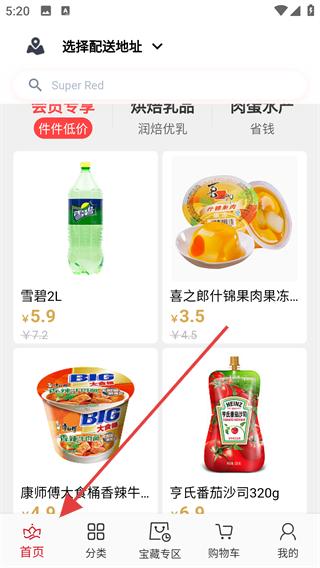 4、登錄后返回首頁,瀏覽新鮮果蔬、優質乳品等商品分類,以及雪碧、喜之郎果凍等具體商品,了解商品價格與優惠,挑選感興趣的商品。