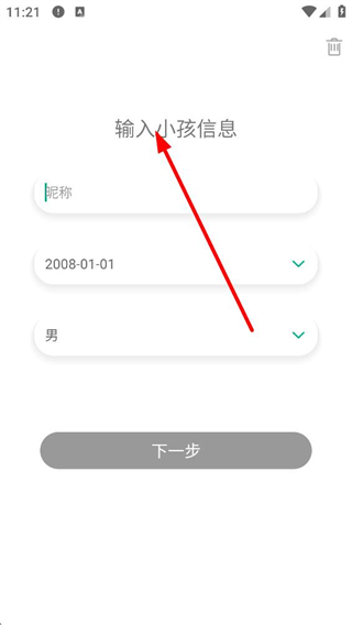 1、進入輸入小孩信息頁面,需填寫昵稱、選擇出生日期與性別,信息填寫完整后,可點擊下一步繼續操作,完善小孩的基礎信息。