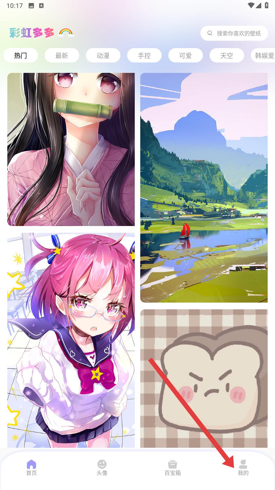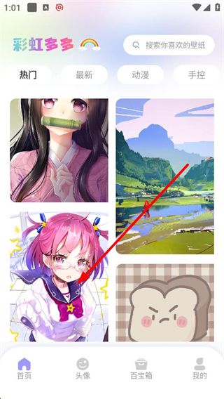 1、進入彩虹多多首頁,可看到熱門最新動漫等分類,展示多種風格的壁紙內容,還能通過搜索欄查找喜歡的壁紙,滿足不同的壁紙選擇需求。