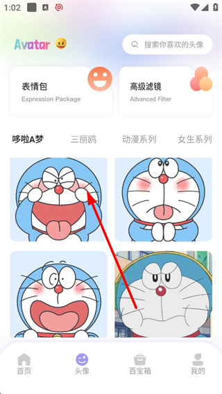 3、切換至頭像板塊,可選擇表情包或高級濾鏡分類,包含哆啦A夢等系列頭像,展示多種風格的頭像內容,供用戶挑選合適的頭像。