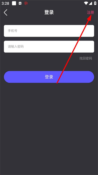 3、登錄界面包含手機號、請輸入密碼的輸入框及登錄按鈕,點擊右上角注冊按鈕,可跳轉至注冊界面。