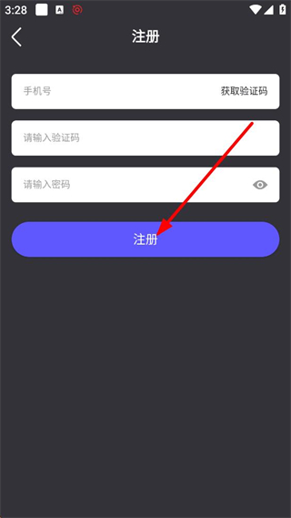 4、注冊界面需填寫手機號、驗證碼、密碼,完成所有信息填寫后,點擊注冊按鈕就能完成注冊流程。