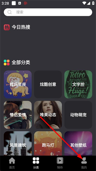 1、進入應用界面可見今日熱搜與全部分類板塊,分類包含姓氏星座、炫酷創意等類型,點擊底部我的按鈕可進入個人頁面。