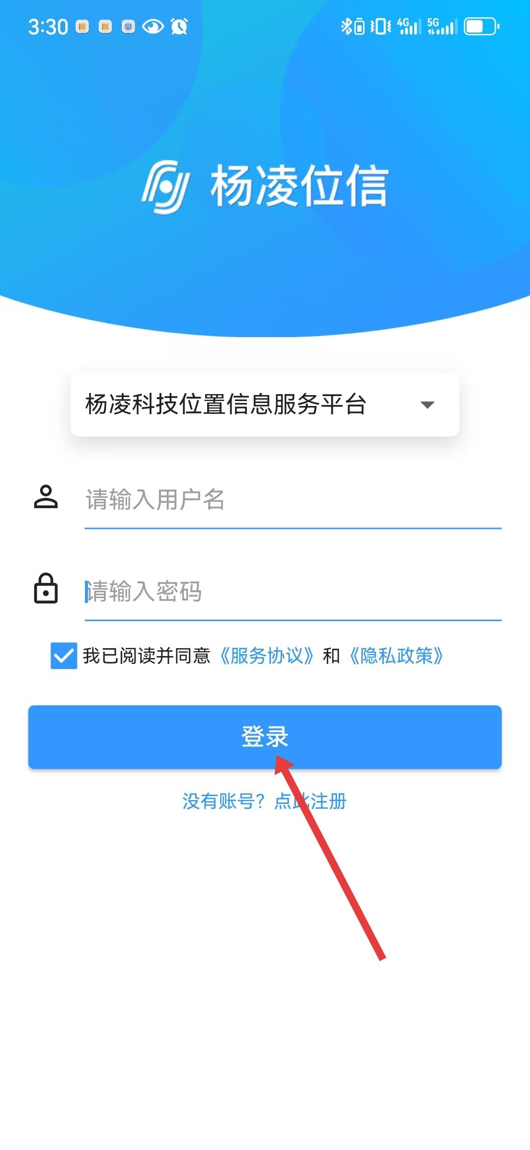 1、打開APP進入登錄界面,在此界面中可看到用戶名和密碼輸入框,若沒有賬號點擊下方沒有賬號點此注冊,即可跳轉至注冊頁面開啟注冊流程。