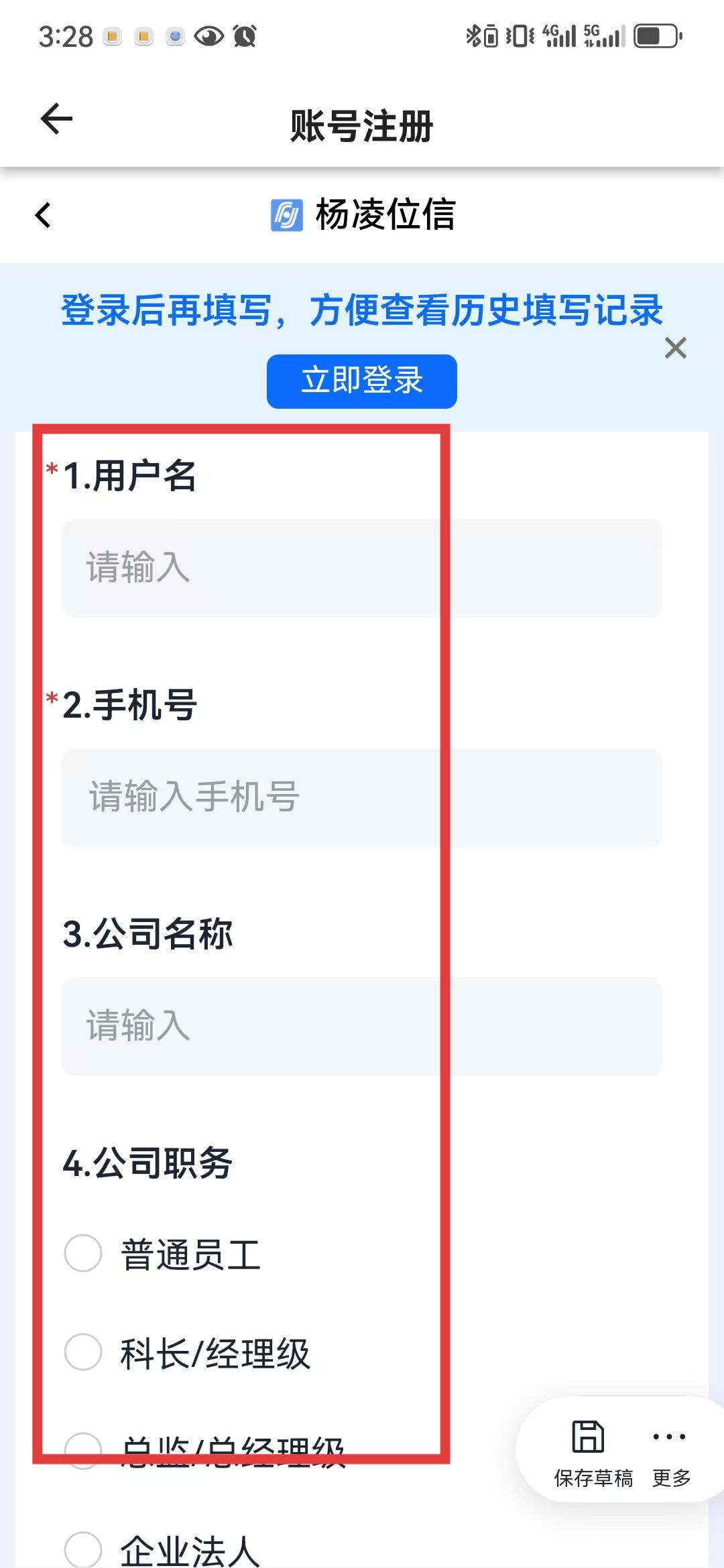 2、進入賬號注冊頁面后,按要求依次填寫信息,帶星號的用戶名和手機號為必填項,公司名稱和公司職務等信息可根據自身情況選填,填寫完成后仔細核對確保信息無誤。