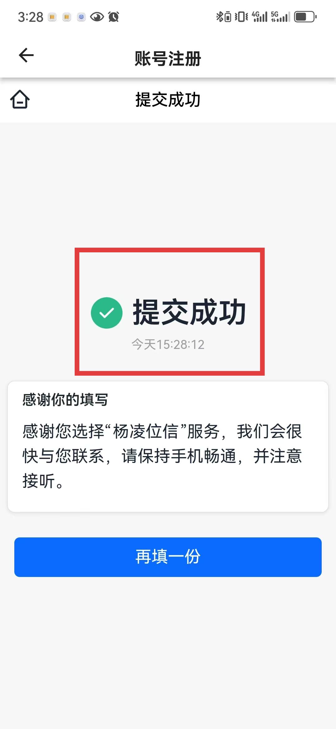 3、信息填寫完畢并確認無誤后,點擊頁面下方的提交按鈕,提交成功后頁面會顯示提交成功提示,同時會提示保持手機暢通等待后續聯系,至此注冊流程完成。