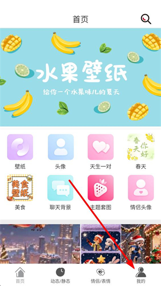 1、進入應用首頁,可見水果壁紙主題展示,下方設壁紙、頭像等功能入口,點擊底部我的按鈕,進入個人界面。
