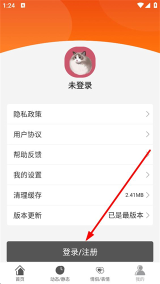 2、進入我的界面后,顯示未登錄狀態,含隱私政策、用戶協議等選項,點擊底部登錄、注冊按鈕,進入登錄頁面。